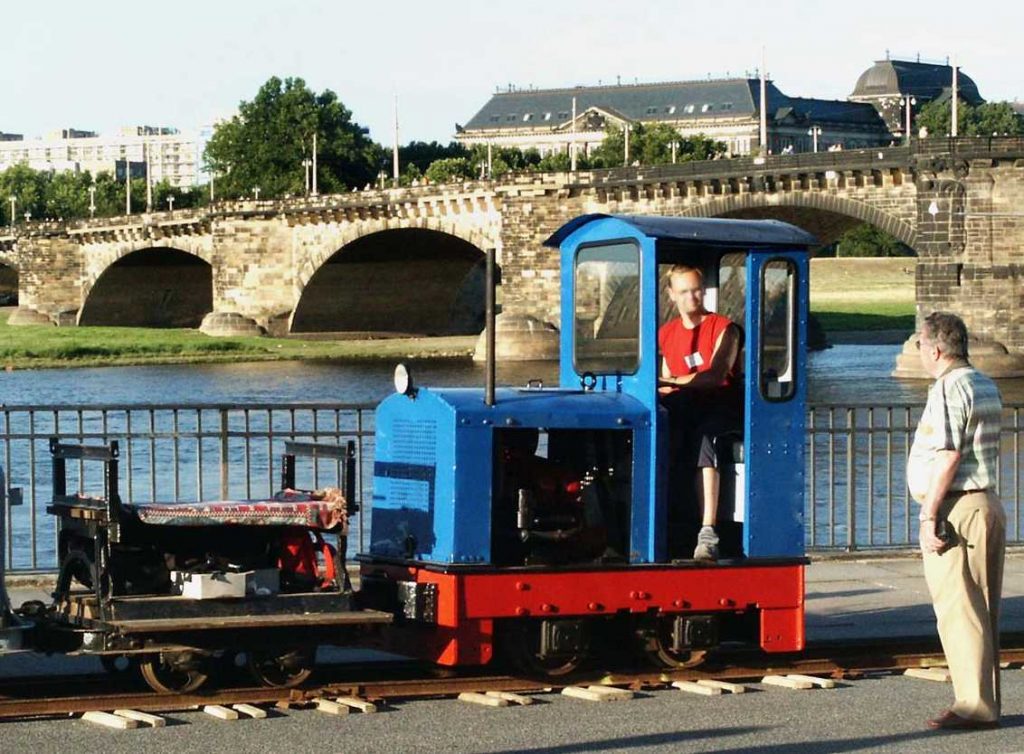 1992 folgten erste Einsätze zu Veranstaltungen in Dresden-Klotzsche. Ursprünglich als potentielles Tauschobjekt vorgesehen, erfreute sich die Lok jedoch zunehmender Beliebtheit wegen ihrer Anspruchslosigkeit und des Elektrostarters. Allerdings waren die Räder schon sehr verschlissen, so daß die Radsätze später noch getauscht wurden. Gleichzeitig erfolgte die Aufnahme in die Sammlungsliste. Und irgendwie bekommt in Dresden jedes blau gestrichene Metallteil den gleichen Spitznamen: “Blaues Wunder”, wie die gleichnamige Brücke in Loschwitz.