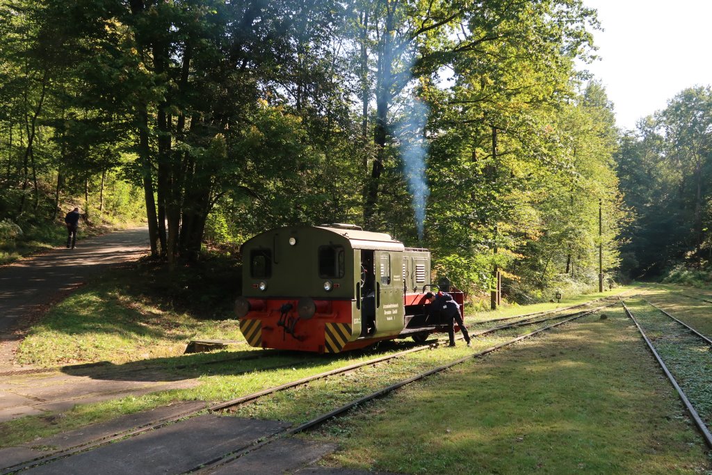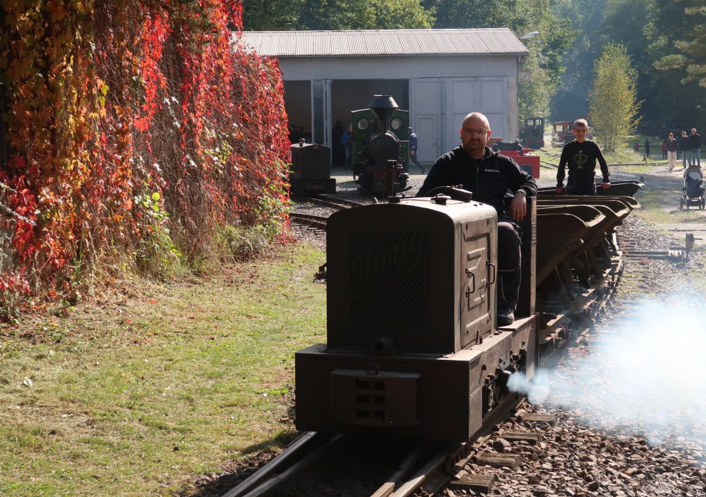 Zwei Wochen nach der Herbstausstellung fand eine Sonderveranstaltung speziell für Fotografen und Filmer statt, wo vor allem speziell Vorkriegsmotorloks mit authentischen Feldbahnzügen im Fokus standen. Hier die O&K RL 1 a aus dem Steinbruch Kohren-Sahlis. Foto: M. Otto, 18.10.2025.