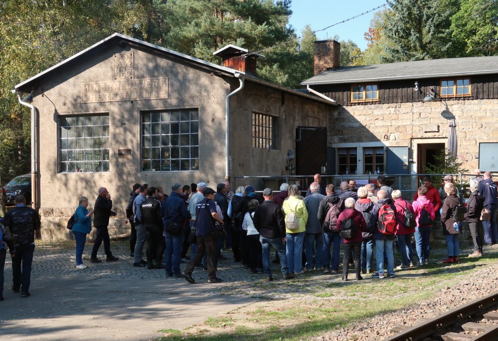 Für interessierte Besucher wurden zweimal am Tag Führungen über das Gelände angeboten. Dabei wurde auch auf die wechselvolle Geschichte des Geländes in der Herrenleite mit den unterschiedlichen Nutzungsepochen eingegangen, bevor 1998 das Feldbahnmuseum einzog. Foto: M. Otto, 3.10.2025.