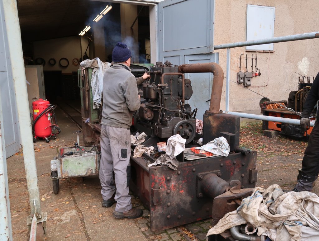 Bei der Jung ZL 233 vom Imprägnierwerk Wülknitz gehen die Arbeiten am Motor voran. Sie besitzt noch den Ursprungsmotor vom Herstellerwerk, welcher hier gerade ersten Betriebstests unterzogen wird. Foto: M. Otto, 31.10.2025.