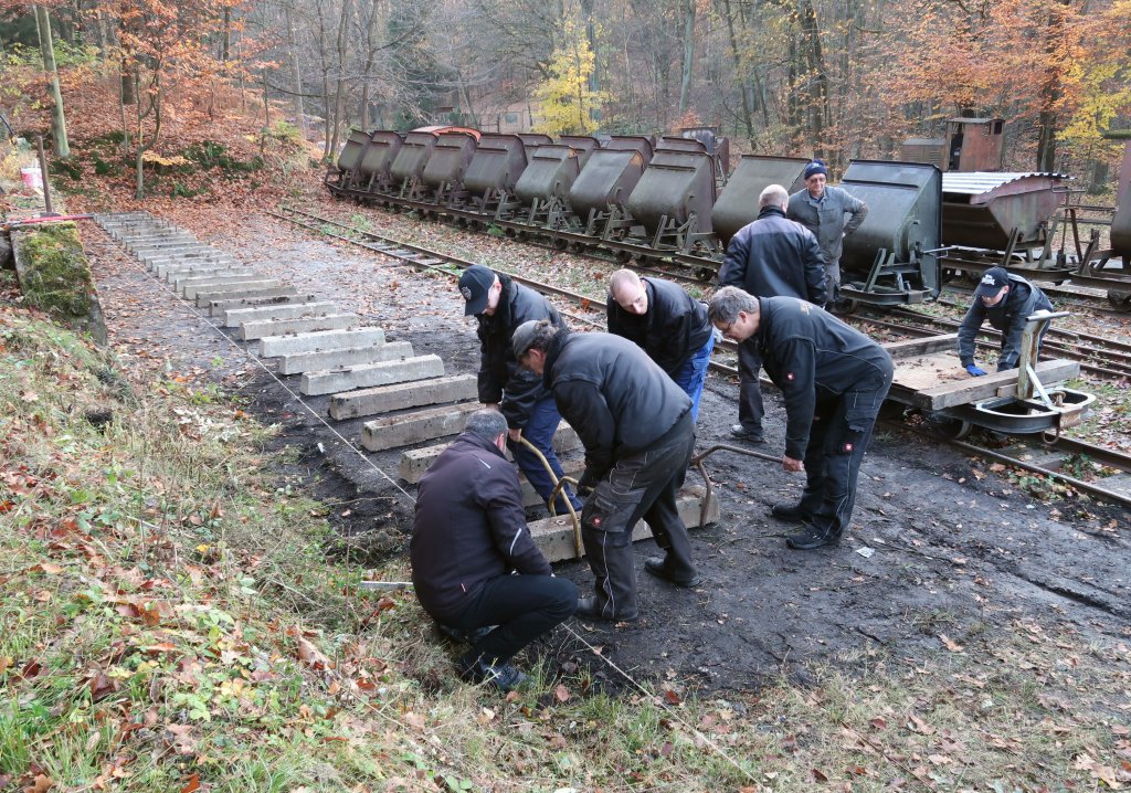 Im Herbst unterstützten uns die Freunde von der Waldeisenbahn Muskau im Rahmen eines Gast-Arbeitseinsatzes beim Gleisbau auf der Regelspurrampe. Verlegt werden hier originale Feldbahnbetonschwellen, welche vorher auf der WEM-Strecke zur Tongrube Mühlrose verbaut waren. Foto: M. Otto, 8.11.2025.