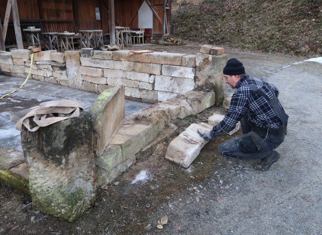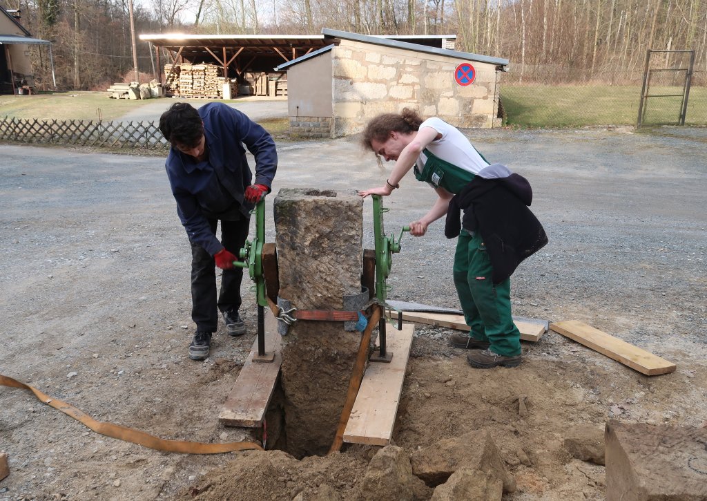 Stabilität gaben dem Gebäude 6 massive Sandsteinsäulen, welche mit einfachsten Mitteln aus dem Untergrund gehoben und anschließend von Hand verladen wurden. Foto: M. Otto, 14.3.2026.