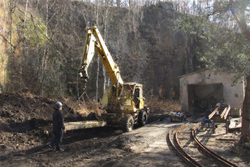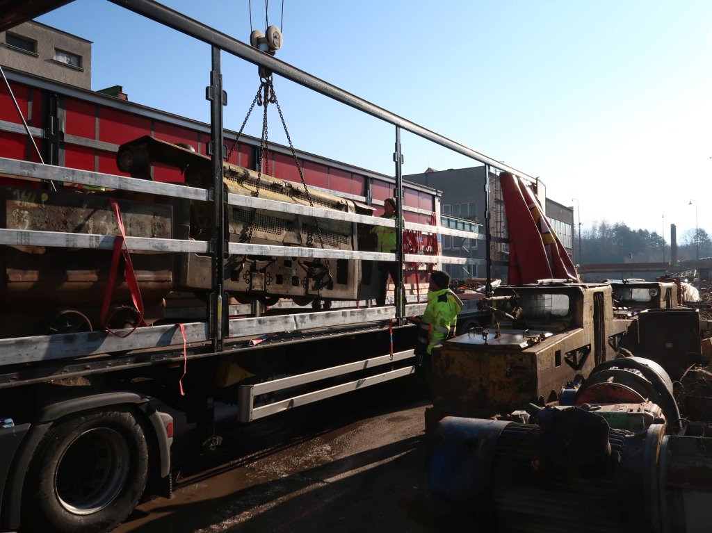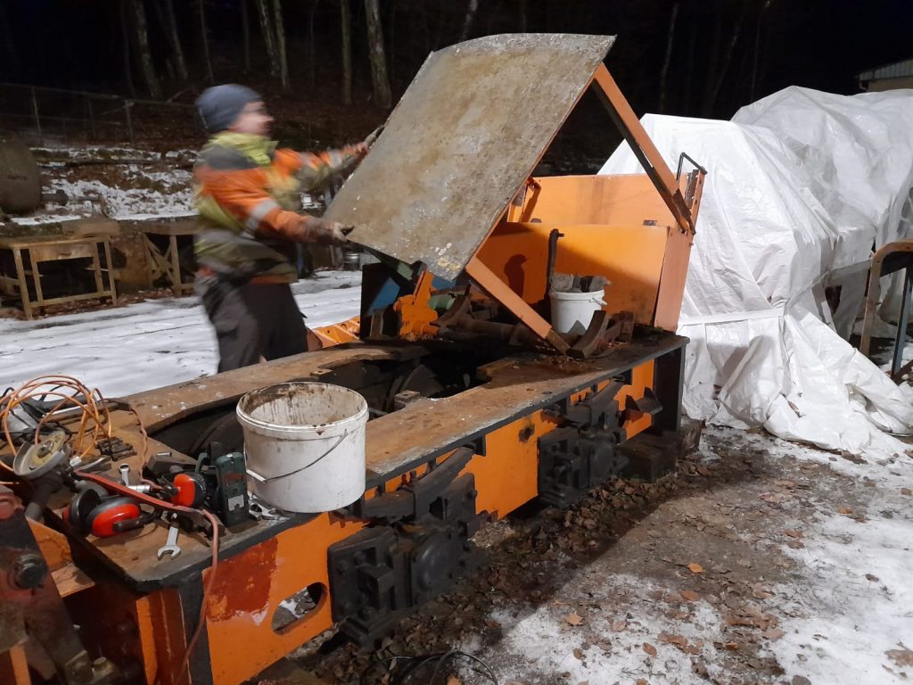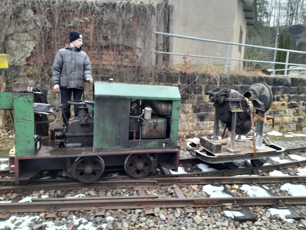 Abschied der „Type M“ von ihrem bisherigen Standort in Nordhausen. Foto: R. Schreier, 13.12.2025. Nachdem wir bereits im vergangenen Jahr zwei Lokomotiven des Typs EL 5 von LEW und einige Wagen der Hornonitrianske bane Prievidza a. s. (Oberneutraer Bergwerke Prievidza AG, HBP) aus der Slowakei in unser Feldbahnmuseum holen konnten, war unser Wunschzettel noch etwas länger: Als typischer Vertreter von Untertage-Dieselloks waren dort auch BND 30 aus tschechoslowakischer Produktion im Einsatz. Vergleichbare Maschinen wurden auch in die DDR geliefert und kamen sowohl über- als auch untertage zum Einsatz. Gemeinsam mit einer EL 5/01 mit Mittelführerstand, welche wir an Bergbaufreunde in Thüringen vermittelt haben, und weiteren Wagen fand Ende Februar der Transport in die Herrenleite statt.
