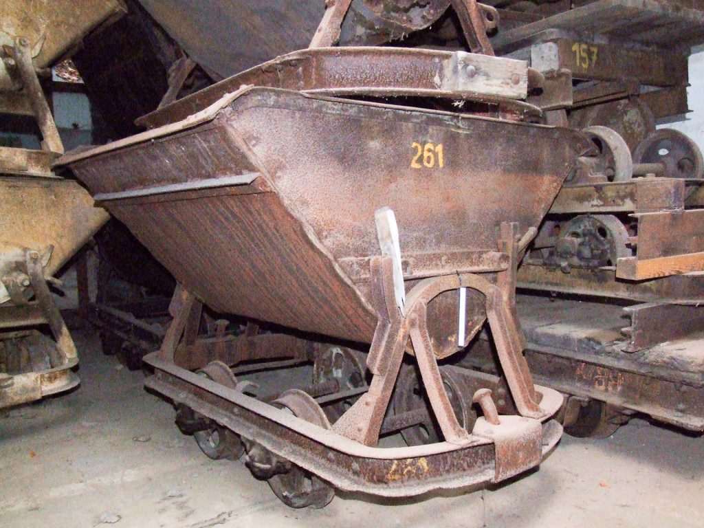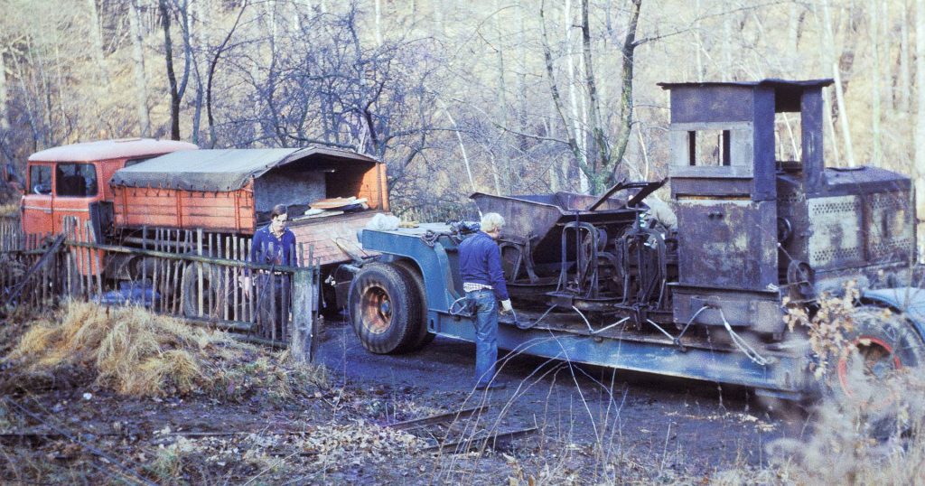 Wagen 261: Leichter Muldenkipper 0,75 m³, genietet Wagen 261 in der Lorenbaracke. Foto: Rainer Dominik, 2025. Abfahrbereit bei der Baufirma Hering in Pirna. Auf dem Tieflader v.l.n.r.: Wagen 261, 101, 102 und Lok 23. Foto: Sammlung HFD, 1982.