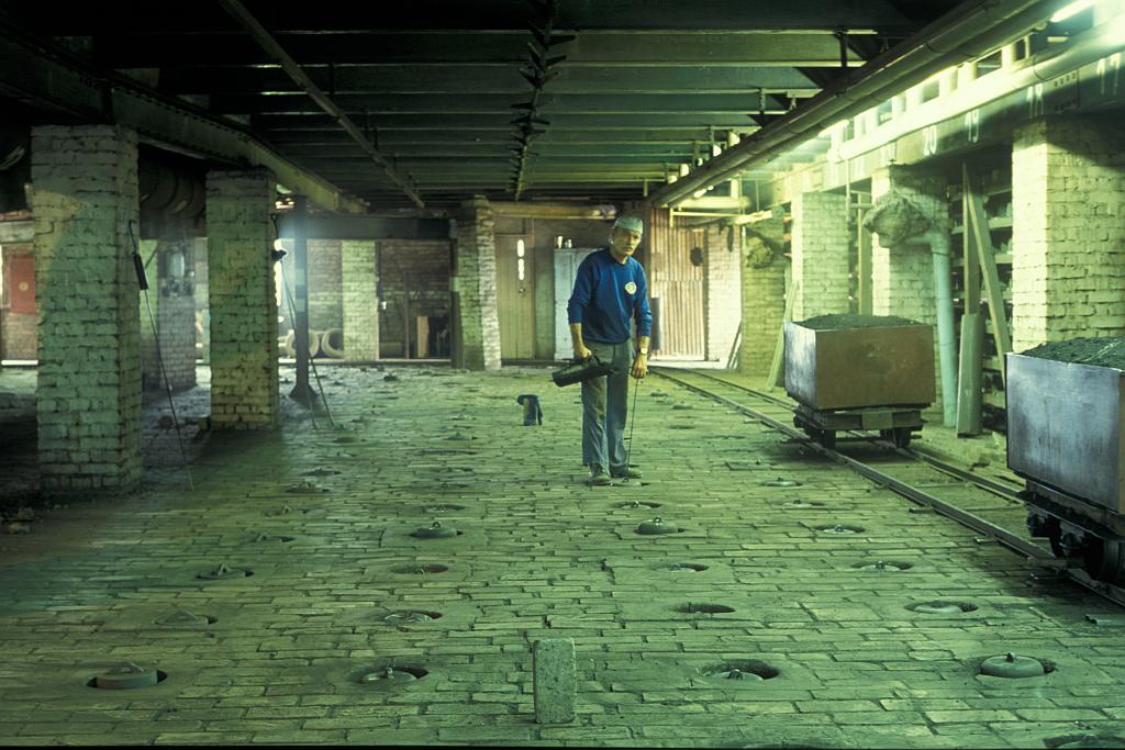 Vom Wagen 800 gibt es bis jetzt kein bekanntes Foto aus seiner Einsatzzeit, deshalb hier eine vergleichbare Szene aus der Ziegelei Dresden-Luga. Der Brennmeister bei der Arbeit. Mit dem Drahthaken hebt der den Deckel an, um mit der Schütte etwas Feinkohle ins Heizloch zu kippen. Die aktuelle Brennzone befindet sich zwischen den beiden senkrecht stehenden Ziegeln im Vordergrund und in der Bildmitte. Rechts stehen zwei Eigenbau-Kastenwagen mit dem Brennstoffvorrat. Einer davon ist vermutlich unser Wagen 822. Foto: Rainer Dominik, 1993.