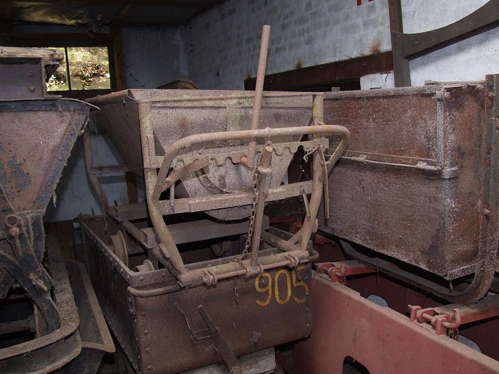 Der Wagen stammt aus der Ziegelei Willkommen, Helmsdorf, aus der auch unsere Loks 58, 59 und 130, sowie die Wagen 107, 807 und 812 sind. Er diente dem Brennstofftransport auf dem Schürboden des Ringofens und ist ein Eigenbau. Der Brennmeister entnahm aus der Mulde alle 10…25 Minuten mit einer speziellen Schütte jeweils nur geringe Mengen Feinkohle, um sie in die Heizlöcher zu geben. Zu diesem Zweck war die Mulde nach jeder Seite in vier Stellungen arretierbar. Nach Aussagen ehemaliger Ziegeleimitarbeiter soll er sich aber nicht bewährt haben.